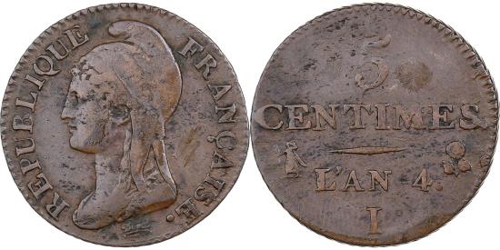 | | France, 5 Centimes, Dupré, AN 4, Limoges, Copper, , Gadoury:124 | | | Draped bust of Marianne wearing a Phrygian cap on the left., Denomination and date. | | FEATURES |