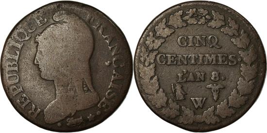 | | Coin, France, Dupré, 5 Centimes, AN 8, Lille, , Bronze, KM:640.11 | | | Dupré, Liberty head left, Value within oak wreath, REPUBLIQUE FRANCAISE <Bullet> * | | FEATURES |