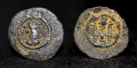 SASANIAN KINGS. Kavād (Kavādh) I. Second reign, AD 499-531. Æ Pashiz ,AS (Aspahan or Aspanvar) mint. Dated RY [...]1. Bust right, wearing mural crown with frontal crescent, two ribbons, and korymbos set on crescent, ribbons and crescents on shoulders; stars flanking head; star-in-crescents in margin / Fire altar with ribbons; flanked by two attendants, [star and crescent flanking flames], RY date to left, mint signature to right. SNS type Ib/1a; cf. Sunrise 966 (obol; for type). Good VF, attractive earthen dark brown patina. Rare. Weight: 0.53g Diameter: 12mm |