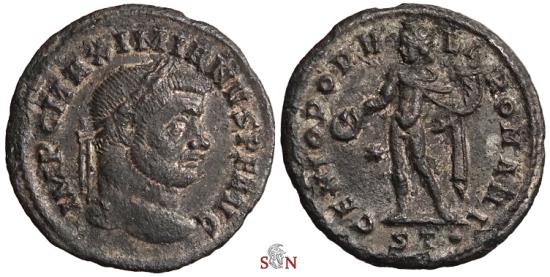 Maximianus Herculius Follis, struck AD 298-299 at Ticinum (Pavia). Obv. IMP C MAXIMIANVS P F AVG, Laureate head right.