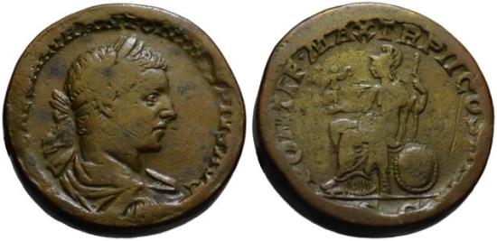 Elagabalus AD 218-222 Æ Sestertius (29.5mm, 25.20 g.) Rome mint, struck AD 219. Obv. Laureate, draped, and cuirassed bust right. Rev. Roma seated left, holding Victory and spear, shield at her side. RIC IV 293 Sharp VF, Dark brown patina. Interesting thick coin (5mm.) edges hammered to turn it into a proto contorniate game counter or being inset into a large medallion. |