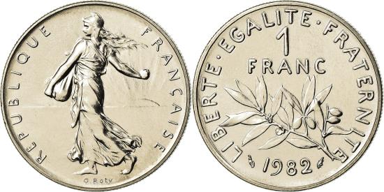 | | Coin, France, Semeuse, Franc, 1982, Paris, FDC, , Nickel, KM:925.1 | | | Semeuse, The Seed Sower, Laurel branch divides denomination and date, Without mint mark., Louis Oscar Roty | | FEATURES |