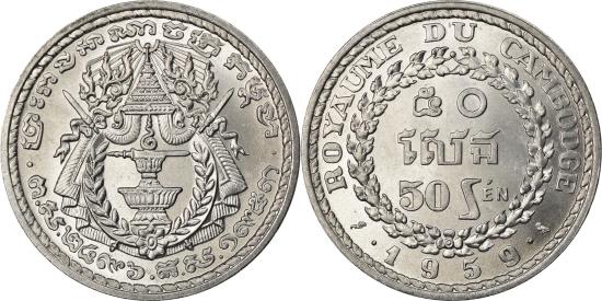 | | Coin, Cambodia, 50 Sen, 1959, , Aluminum, KM:56 | | | Royal emblem, Denomination within wreath | | FEATURES |