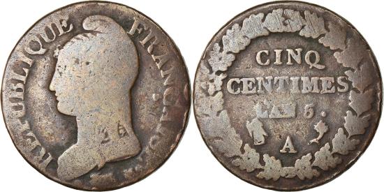 | | Coin, France, Dupré, 5 Centimes, AN 5, Paris, , Bronze, KM:640.1 | | | Dupré, Liberty head left, Value within oak wreath, REPUBLIQUE FRANCAISE <Bullet> * | | FEATURES |
