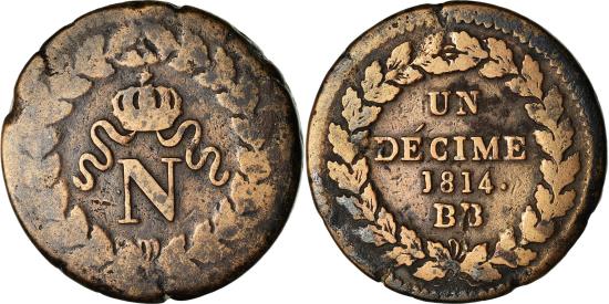 | | Coin, France, Napoléon I, Decime, 1814, Strasbourg, point after date only | | | Napoléon I, Crowned monogram within wreath, Denomination within wreath | | FEATURES |