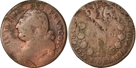 | | Coin, France, Louis XVI, 12 Deniers, 1792, Marseille, , Copper | | | 12 deniers françois, Bust of Louis XVI left, Liberty cap above column dividing value, wreath surrounds, LOUIS XVI ROI DES FRANCOIS | | FEATURES |