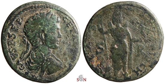 | Geta AE 32 mm, struck AD 198-209 at Pisidia, Antiochia mint. Obv: IMP CAES P SEP GETAS AVG, laureate, draped, and cuirassed bust right. Rev: COL CAES ANTIOCH, Mên standing facing, head
