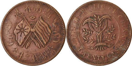 | | Coin, China, HUNAN PROVINCE, 20 Cash, 1919, , Copper, KM:400.9 | | | Sharp pointed star above crossed flags, long inner ribbons, THE REPUBLIC OF CHINA | | FEATURES |