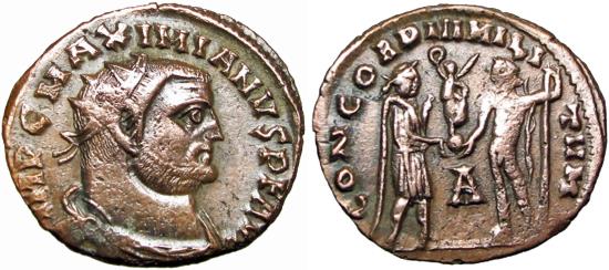 Maximianus. First reign, AD 286-305. Æ Fraction (22mm, 3.18 g, 1h). Alexandria mint, 2nd officina. Struck circa AD 296-297. Radiate, draped, and cuirassed bust right / Maximianus standing right, receiving small Victory on globe from Jupiter standing left, holding scepter; B//ALE. RIC VI 46b. Brown patina, Near EF. |
