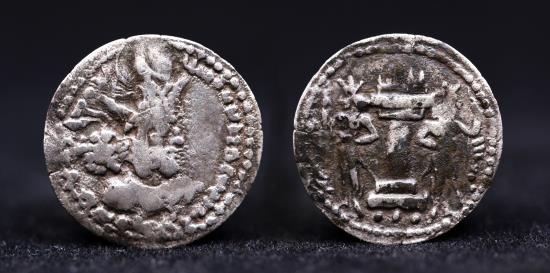 SASANIAN KINGDOM: Shahpur (Sabuhr) I, 241-272, AR obol, G-25, SNS-22, king's bust, wearing tiara headdress with korymbos & earflaps // fire altar guarded by two assistants, short Pahlavi word to right of the flames, choice VF, R. Weight: 0.65g Diameter: 15mm |