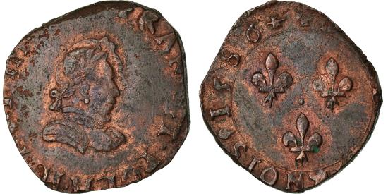 | | Coin, France, Henri III, Double Tournois, 1586, La Rochelle, , Copper | | | 3e type, petit buste du Denier, Frappe tréflée | | FEATURES |