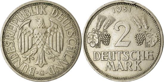 | | Coin, GERMANY - FEDERAL REPUBLIC, 2 Mark, 1951, Karlsruhe, | | | Eagle, Denomination flanked by leaves, grapes, and grain sprigs, date above | | FEATURES |