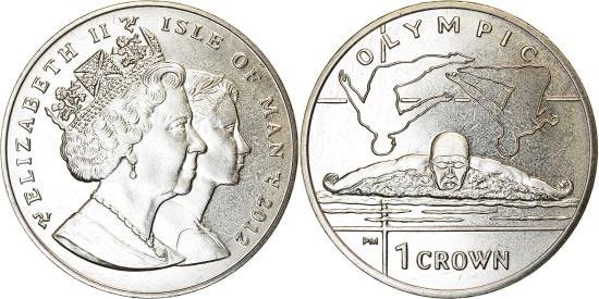| | Coin, Isle of Man, Elizabeth II, Crown, 2012, Pobjoy Mint, Discipline olympique | | | Swimmer with divers in background | | FEATURES |