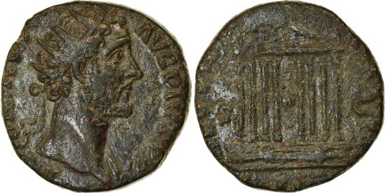 | | Coin, Antoninus Pius, Dupondius, 145-161, Rome, Rare, , Bronze | | | Front view of octastyle temple, in which are seated statues of Divus Augustus and Livia | | FEATURES |