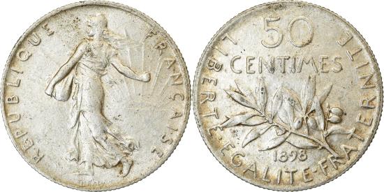| | Coin, France, Semeuse, 50 Centimes, 1898, Paris, , Silver, KM:854 | | | Semeuse, Figure sowing seed, Leafy branch divides date and denomination, Without mint mark. | | FEATURES |