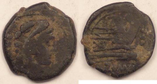 Rev: Prow of galley right with 3 pellets before and the inscription TA in monograms above and ROMA below
