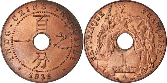 | | Coin, FRENCH INDO-CHINA, Cent, 1938, Paris, , Bronze, KM:12.1 | | | Center hole within statue, denomination below, mint mark A for Paris mint, Symbols at four sides of center hole within circle, date below | | FEATURES |