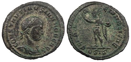 AE3 3.21g. 21mm. 317 A.D. Siscia Mint Laureate, draped and cuirassed bust, r. CONSTANTINVS IVN NOB CAES Sol radiate, standing l., raising r. hand, holding globe in l.; In ex.: ESIS CLARITAS R-EIPVBLICAE RIC VII 37 Scarce. Dark patina with some underlying lustrous silvering. Light porosity. Listed as rarity R3 in RIC.