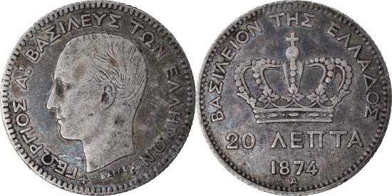 | | Coin, Greece, George I, 20 Lepta, 1874, Paris, , Silver, KM:44 | | | Head left, Crown | | FEATURES |