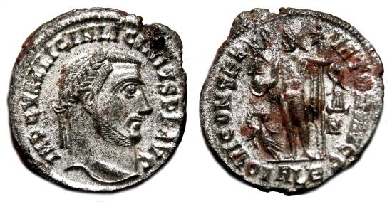 Obverse: IMP C VAL LICIN LICINIVS P F AVG. Laureate head to right. Reverse: IOVI CONSERVATORI AVGG. Jupiter standing left, holding Victory on globe and sceptre, eagle at foot with wreath in its beak, wreath over Δ over N in right field, ALE in exergue.