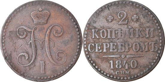 | | Coin, Russia, Nicholas I, 2 Kopeks, 1840, Saint-Petersburg, , Copper | | | Crowned monogram, Value, date | | FEATURES |