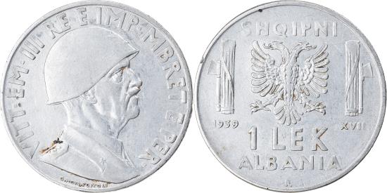 | | Coin, Albania, Vittorio Emanuele III, Lek, 1939, Rome, , Stainless | | | Helmeted head right, Double eagle between columns, value below, Coins dated after 1939 were not struck for circulation. | | FEATURES |