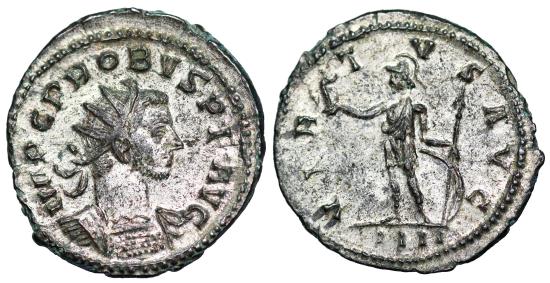Probus A.D. 281 Silvered Antoninianus 23x24mm 3.8g IMP C PROBVS P•F•AVG; Radiate, cuirassed bust right. VIRTVS AVG; Virtus stg. l., holding victory and spear, l. hand on shield. In ex. IIII RIC V Lugdunum 112