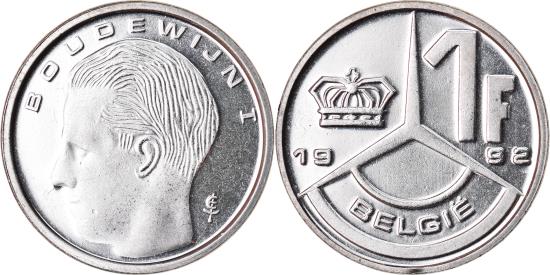 | | Coin, Belgium, Franc, 1992, , Nickel Plated Iron, KM:171 | | | Head left, small mark lower right, legend in Dutch, Center symbol divides Crown at left from denomination at right and dates, legend in Dutch, BOUDEWIJN I | | FEATURES |