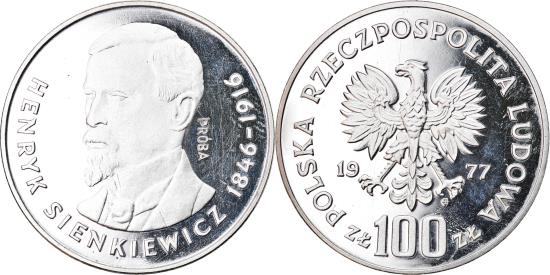| | Coin, Poland, 100 Zlotych, 1977, Warsaw, ESSAI, , Silver, KM:Pr299 | | | Sienkiewicz facing. | | FEATURES |