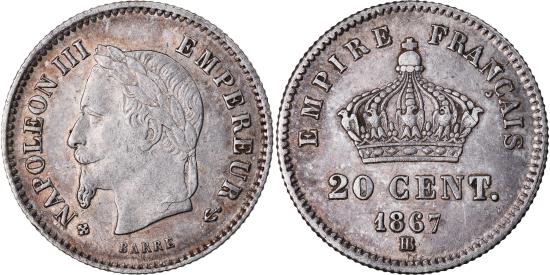 | | Coin, France, Napoleon III, Napoléon III, 20 Centimes, 1867, Strasbourg | | | Napoléon III, Laureate head left, Crown above denomination | | FEATURES |