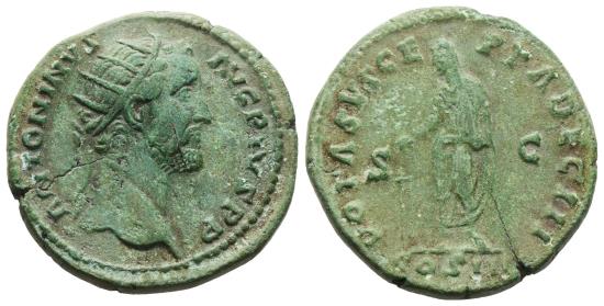 ANTONINUS PIUS. Ae, Dupondius. AD 145-161. Rome. Obv/ ANTONINVS AVG PIVS P P, radiate head right. Rev/ VOTA SVSCEPTA DEC III, Antonius standing left, sacrificing with patera over tripod; COS IIII in exergue, S-C across fields. Cat: SNG BM Black Sea 110; SNG Copenhagen 354. Bronze (Ae) 11,3g - 27mm. Attractive pale green patina. |
