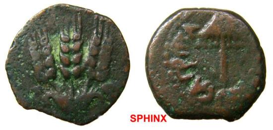 499RC9X) JUDAEA, Herodians. Agrippa I. 37-43 CE. AE Prutah (16 mm, 2.11 g). Jerusalem mint. Uncertain date. Umbrella-like canopy with fringes / Three grain ears; date flanking.