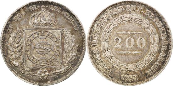 | | Coin, Brazil, Pedro II, 200 Reis, 1857, , Silver, KM:469 | | | Denomination within leafy spray, Crowned arms within wreath | | FEATURES |