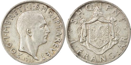 | | Coin, Albania, Zog I, Frang Ar, 1935, Rome, , Silver, KM:16 | | | Head right, date below, King's Arms, value below | | FEATURES |