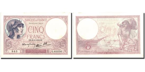 | | Banknote, France, 5 Francs, 5 F 1917-1940 ''Violet'', 1939, 1939-09-28 | | | Woman wearing helmet at left. Signature title: LE CAISSIER GÉNÉRAL., Dock worker and sailing ship., Lilac. | | FEATURES |
