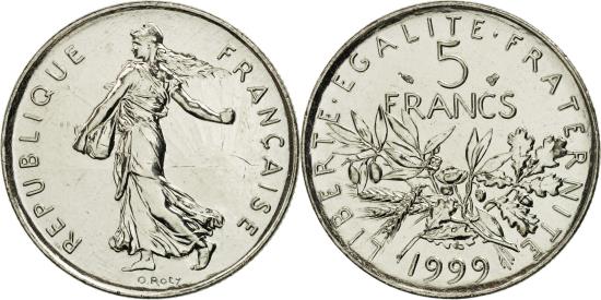 | | Coin, France, Semeuse, 5 Francs, 1999, Paris, , Nickel Clad | | | Semeuse, The Seed Sower, Branches divide denomination and date | | FEATURES |