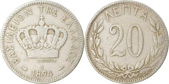 | | Greece, George I, 20 Lepta, 1894, Athens, , Copper-nickel, KM:57 | | | Crown, Denomination within wreath | | FEATURES |