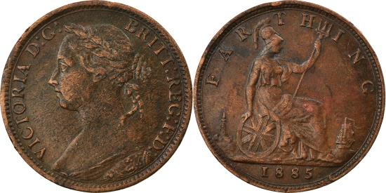 | | Coin, Great Britain, Victoria, Farthing, 1885, , Bronze, KM:753 | | | Laureate bust left, Britannia seated right, VICTORIA D:G: BRITT: REG: F:D: | | FEATURES |