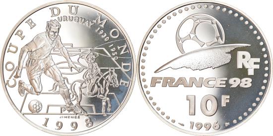 | | Coin, France, World Cup 98, Uruguay, 10 Francs, 1996, Proof, , Silver | | | World Cup 1998 logo above denomination, Stylized gaucho and soccer player, date below | | FEATURES |