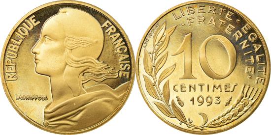 | | Coin, France, Marianne, 10 Centimes, 1993, Paris, Proof, | | | Marianne, Liberty bust left, Denomination above date, grain sprig below, laurel branch at left, Without mint mark. 1991-1993 dated coins, non-Proof, exist in both coin and medal alignment., Henri Lagriffoul | | FEATURES |