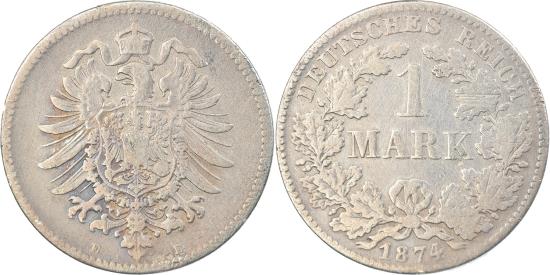 | | Coin, GERMANY - EMPIRE, Wilhelm I, Mark, 1874, Muldenhütten, , Silver | | | Denomination within wreath, Crowned imperial eagle | | FEATURES |