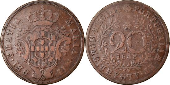 | | Coin, Azores, 20 Reis, 1843, , Copper, KM:12 | | | Crowned arms on ornate shield, Denomination and date within wreath | | FEATURES |