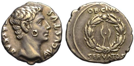 Augustus 27 BC-AD 14. AR Denarius (19mm, 3.75 g.) Spanish mint (Colonia Patricia?) Struck circa 19 BC. Obv. Bare head right. Rev. Oak wreath with ties facing upward, OB CIVIS SERVATOS RIC I 75 About EF, Banker's mark on cheek, otherwise outstanding portrait. Nicely toned. |