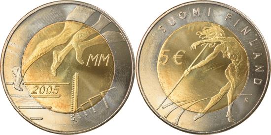 | | Finland, 5 Euro, Helsinki Athletic Championship, 2005, Vantaa, | | | Female javelin thrower, denomination, Running feet | | FEATURES |