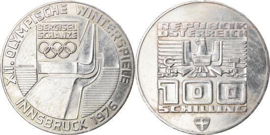 | | Coin, Austria, 100 Schilling, 1976, Vienna, , Silver, KM:2929 | | | Box surrounds stylized Imperial Eagle, Austrian shield on breast, above value, small shield below box, Ski jump, Olympic logo upper left, circle surrounds, date lower right | | FEATURES |