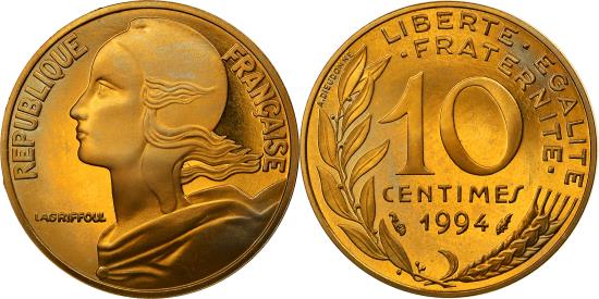 | | Coin, France, Marianne, 10 Centimes, 1994, Paris, BE, , Aluminum-Bronze | | | Marianne, Liberty bust left, Denomination above date, grain sprig below, laurel branch at left, Without mint mark. 1991-1993 dated coins, non-Proof, exist in both coin and medal alignment., Henri Lagriffoul | | FEATURES |