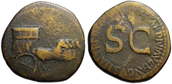 Tiberius AD 14-37. Æ Sestertius (35mm, 26.62 g.) Rome mint, struck AD 35-36. Obv. Empty horse-drawn triumphal quadriga right, its side ornamented with trophy, Victory and trophy, and captive. Rev. Legend around large SC. RIC I 60. Good Fine, Nice brown riverine patina. Rare The empty Quadriga probably alludes to the action of L. Vitellius against the Parthians. |