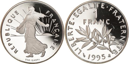 | | Coin, France, Semeuse, Franc, 1995, Paris, Proof, , Nickel, KM:925.1 | | | Semeuse, The Seed Sower, Laurel branch divides denomination and date, Without mint mark., Louis Oscar Roty | | FEATURES |