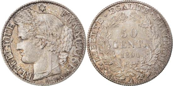 | | Coin, France, Cérès, 50 Centimes, 1894, Paris, , Silver, KM:834.1 | | | Cérès, Laureate head left, Denomination within wreath | | FEATURES |