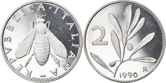 | | Coin, Italy, 2 Lire, 1990, Rome, Proof, , Aluminum, KM:94 | | | Honey bee, Olive branch and value, The 1968-1969 and 1982-2001 dates were issued in sets only. | | FEATURES |